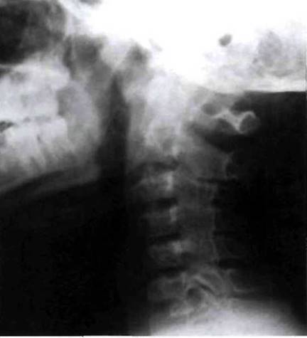 Рис. 23-14. Анкилоз дугоотростчатых сочленений в шейном отделе позвоночника у больного ЮАС.