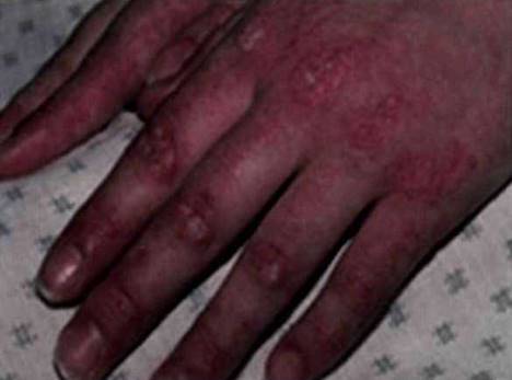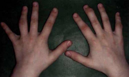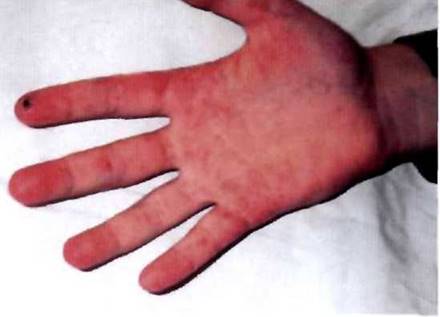 Рис. 27-1. Симптом Готтрона при ювенильном дерматомиозите: эритематозные папулы с кератозом над мелкими суставами кистей (пястно-фаланговыми, проксимальными и дистальными межфаланговыми).