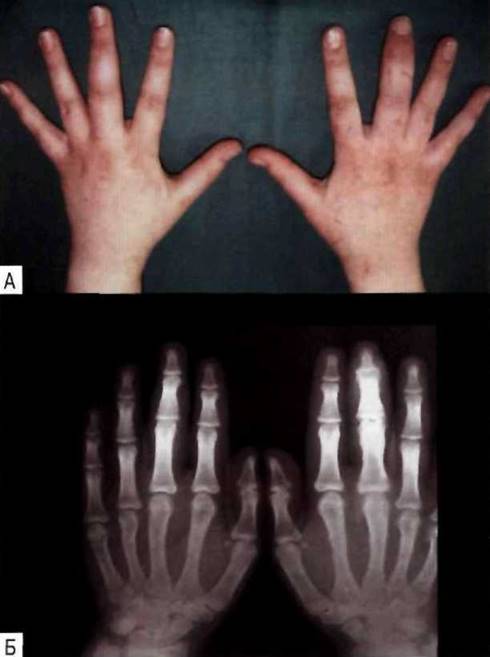 Рис. 23-18. Дактилит трёх пальцев кистей с развитием периоститов: А - внешний вид кистей; Б - рентгенограмма.
