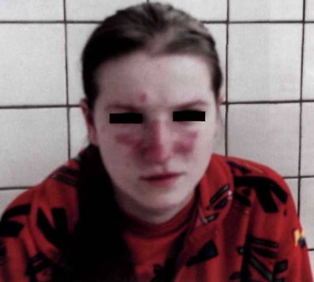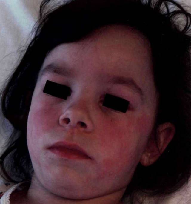 Рис. 27-4. Типичные эритематозные изменения на лице при ювенильном дерматомиозите: параор- битальная эритема с отёком («симптом лиловых очков»), разлитая эритема лица, хейлит.