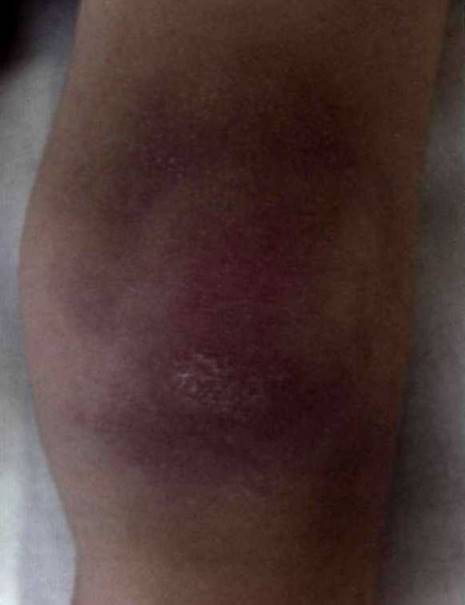 Рис. 27-2. Симптом Готтрона при ювенильном дерматотозите: эритематозные папулы с кератозом над коленным суставом.
