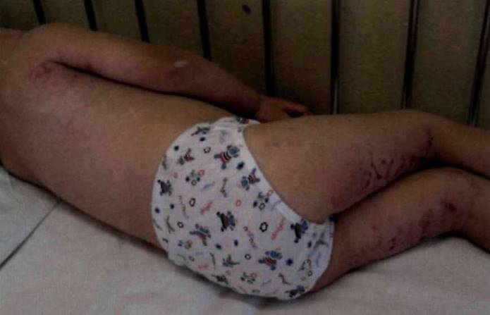 Рис. 27-5. Проявления системной васкулопатии при ювенильном дерматомиозите: древовидное ливедо в области плечевого пояса и на бёдрах с выраженными трофическими нарушениями (изъязвления, корочки) у ребенка младшего возраста.