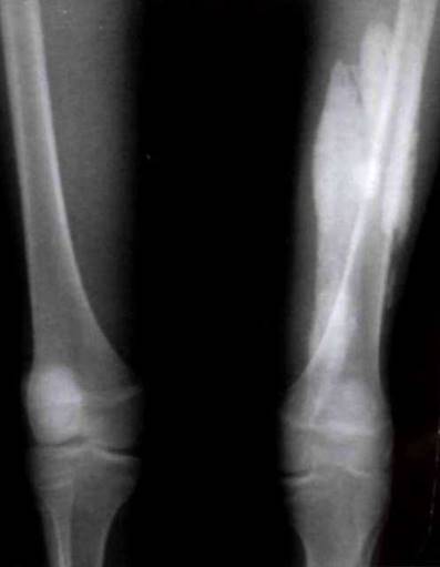 Рис. 27-7. Массивные кальцинаты (кальцификация всей двуглавой мышцы бедра) у девочки с длительно не купирующейся активностью ювенильного дерматомиозита.