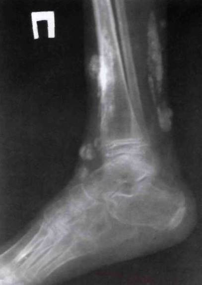 Рис. 23-4. Поражение суставов предплюсны (тарзит) и теносиновиты области наружной и внутренней лодыжек у больного ЮАС.