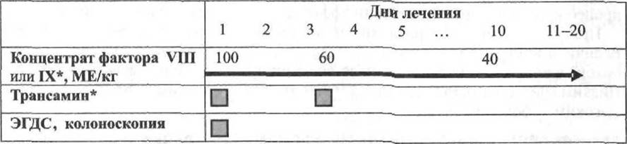 При желудочно-кишечных кровотечениях показано эндоскопическое исследование для уточнения причины и источника кровотечения. Протокол лечения представлен на рис. 18-3. Желаемый уровень фактора — 60-80%. Необходимо активное применение ингибиторов фибринолиза, а также лечение, общепринятое при эрозивно-язвенных заболеваниях желудка и кишечника.