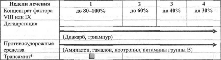 Опасные для жизни кровотечения, в том числе кровоизлияния в головной мозг, и обширные хирургические вмешательства требуют введения КФС из расчёта 50-100 МЕ/кг 1-2 раза в сутки до купирования признаков кровотечения и последующего поддерживающего лечения меньшими дозами до заживления раны. Протокол ведения больного гемофилией с внутричерепным кровоизлиянием представлен на рис. 18-4. Непрерывная инфузия КФС в дозе 2 МЕ/кг в час обеспечивает их постоянный уровень не ниже 50% нормы. Кроме того, показано применение ингибиторов фибринолиза. В дальнейшем гемостатическое воздействие ведут по схеме профилактического лечения в течение 6 мес.