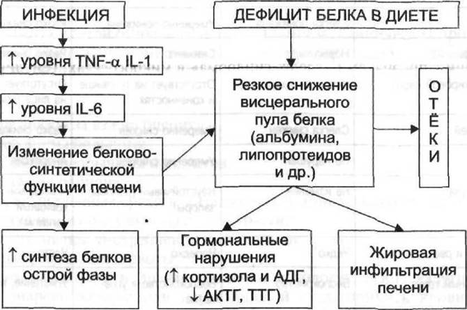 В качестве причин развития наиболее тяжёлых форм БЭН в настоящее время чаще выступают эндогенные факторы (табл. 7-2), требующие своевременной и адекватной коррекции нутритивного статуса. К развитию БЭН часто приводят острые и хронические инфекционные заболевания.