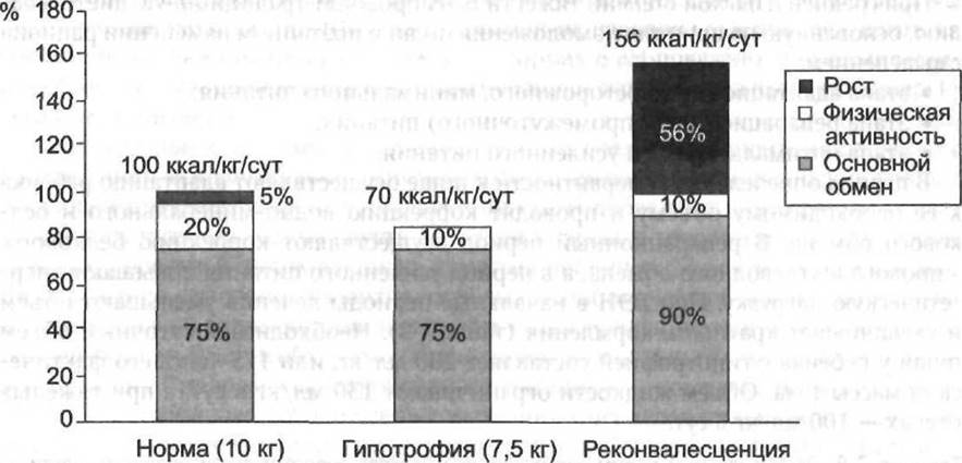 водящую к кардинальной перестройке метаболических процессов и изменению реактивности организма. У ребёнка резко возрастает интенсивность основного обмена и потребности в энергии и пластическом материале существенно повышаются (табл. 7-3).